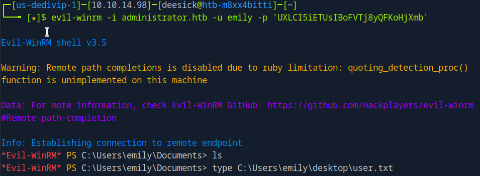 With these credentials I mapped each discovered username and tested them against services to find the easiest access path. emily authenticated successfully over SMB and WinRM, so I pivoted to her account via evil-WinRM:
