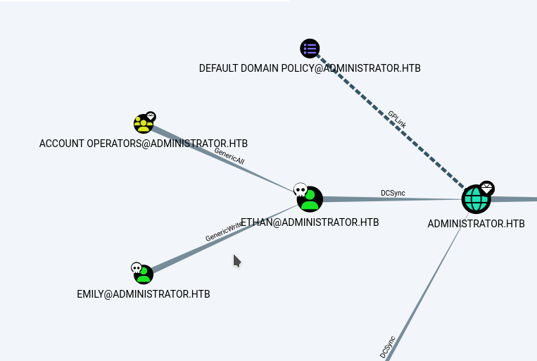 Administrator is a medium Windows box built around a full domain-compromise chain. You’re given low-privileged credentials and must enumerate ACLs, SMB/WinRM, and AD data. BloodHound shows olivia has GenericAll on michael, so we reset Michael’s password, pivot, and use his ForceChangePassword right to take benjamin. Benjamin’s FTP contains Backup.psafe3, which we crack to recover plaintext credentials. Those creds score a valid emily login. emily’s GenericWrite on ethan enables a targeted Kerberoast. Cracking the service hash reveals ethan, who holds DCSync rights, allowing NTDS extraction and the final Administrator hash.
