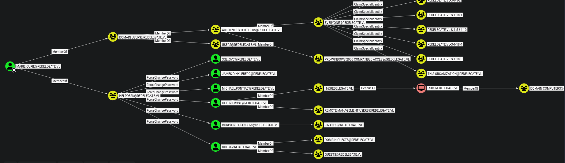 Redelegate is a hard Windows AD machine that opens with Anonymous FTP exposure, leaking a KeePass database that leads to a valid local MSSQL login. Using that foothold to enumerate domain accounts reveals a weakly protected user, marie.curie, who holds ForceChangePassword rights over helen.frost. Once Helen is compromised, her membership in Remote Management Users grants direct WinRM access to the domain controller. Helen also has SeEnableDelegationPrivilege and GenericAll over the FS01$ computer object, allowing the attacker to reset its password, configure constrained delegation, and ultimately impersonate a privileged account to perform a DCSync and take the domain.